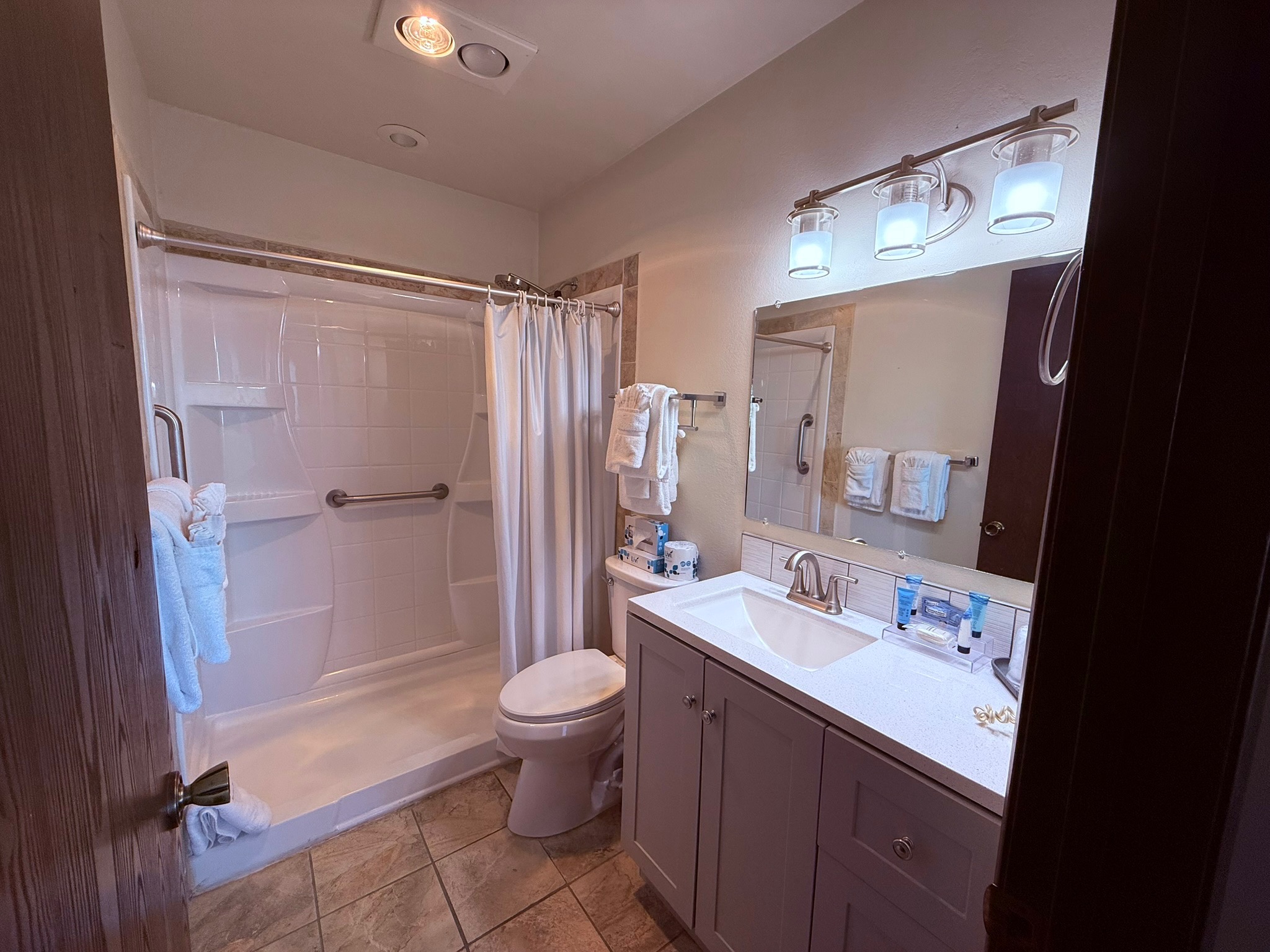 Sleeps up to 3. Queen and Twin Bed Standard, 3/4 bath, Private Patio looking onto landscaped lawns